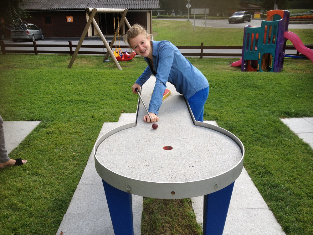 Direkt auf unserer Sonnenterrasse: Pit-Pat Anlage mit 12 Bahnen für Groß und Klein. Pit-Pat wird mit Ball und Spielstock (Queue) auf einer Pit-Pat-Anlage gespielt. Zweck dieses Spieles ist, den Ball mit möglichst wenigen Stößen vom Abschlag ins Ziel zu bringen.